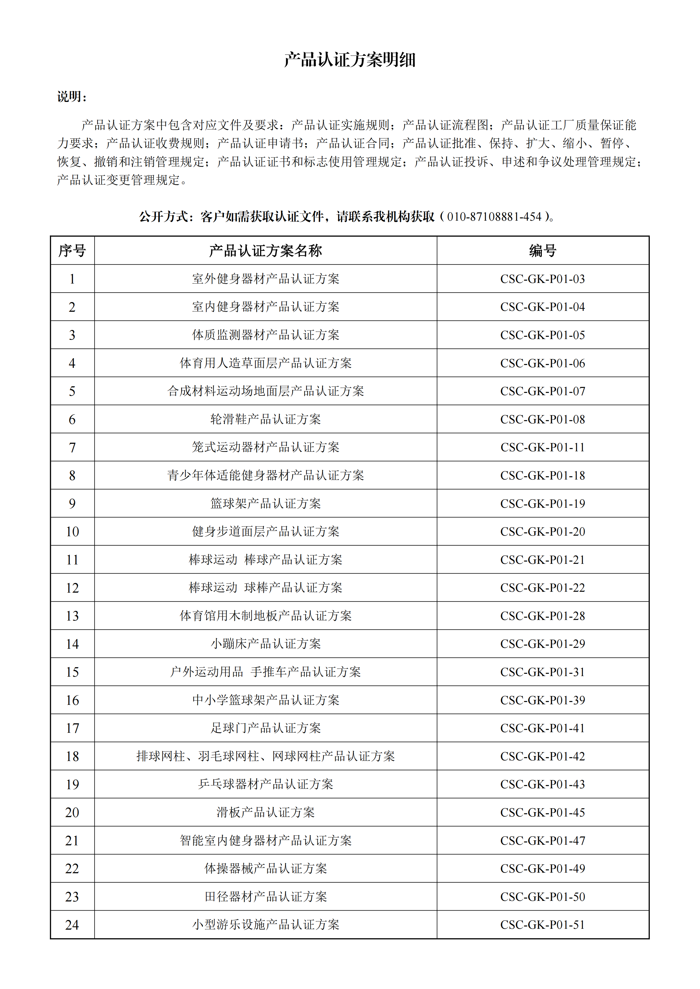 自愿性产品认证,认证范围:滑雪产品;球门、球架产品;冰鞋产品;乒乓球产品;轮滑产品;羽毛球产品;水上运动产品;网球产品;室内健身器材产品;高尔夫球产品;门球产品;室外健身器材产品;棒球、垒球产品;健身小器械产品;按摩器材产品;发球器产品;体操器材产品;运动手套产品;钓鱼产品;田径器械产品;举重器械产品;登山运动器材产品;武术器械产品;休闲设备产品;射箭产品;军事体育器材产品;击剑产品;场馆设施辅助器材产品;训练器材产品;体育用人造草产品;拳击台产品;运动面层产品;游泳池产品;体质监测产品;球类产品;老年人健身器材产品等。