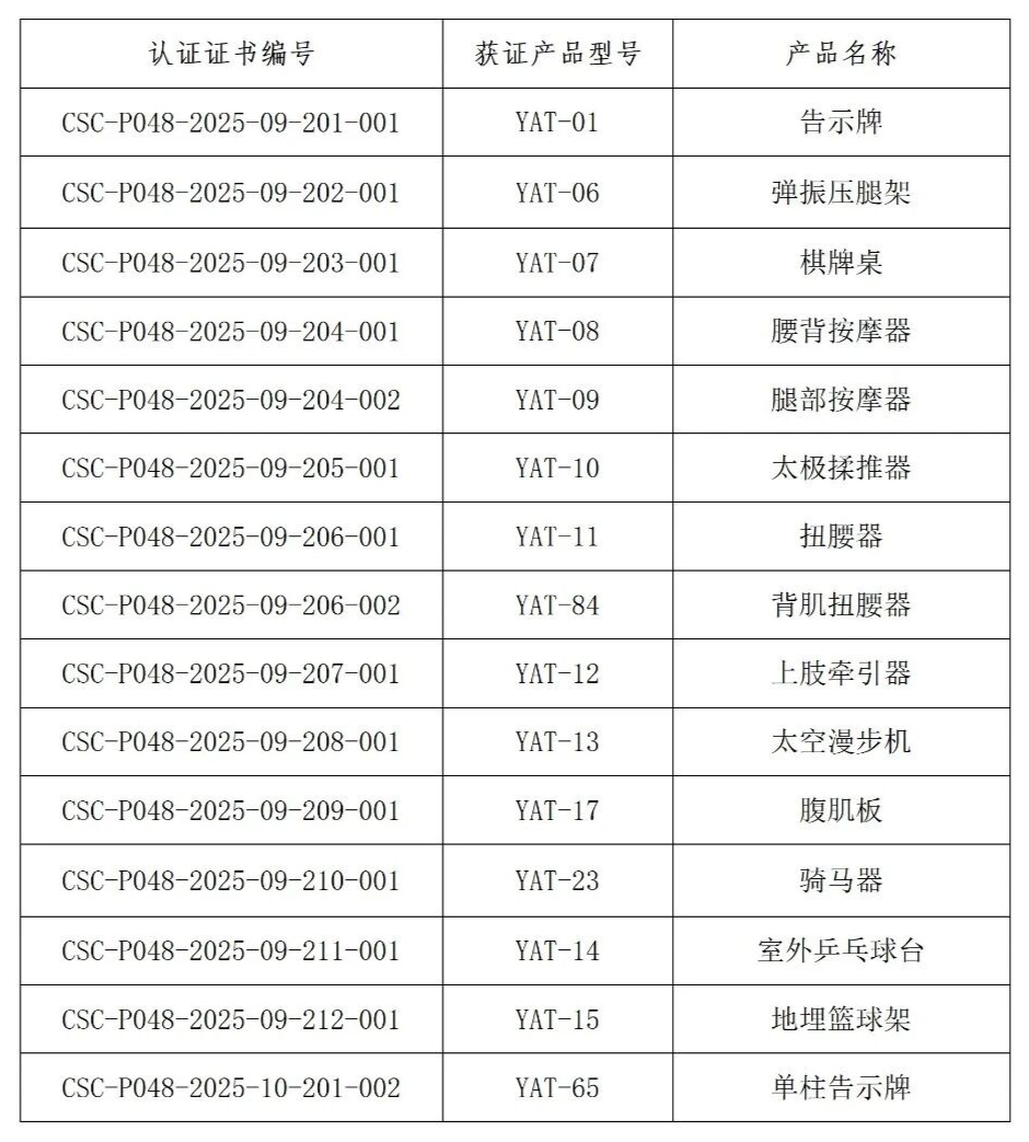 沧州市益奥特体育装备有限公司获得由中体联(北京)认证服务有限公司颁发的产品认证证书,证书明细如下:(共15张),特此公告。