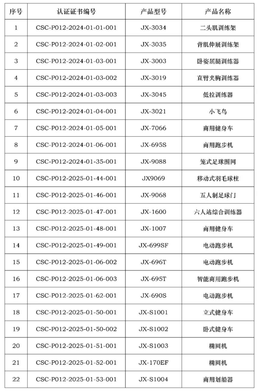 江苏康力源体育科技股份有限公司获得由中体联(北京)认证服务有限公司颁发的产品认证证书,证书明细如下(共88张),特此公告。