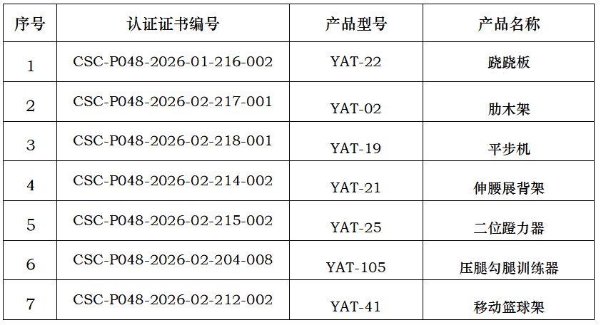 沧州市益奥特体育装备有限公司获得由中体联(北京)认证服务有限公司颁发的产品认证证书,证书明细如下(共7张):、