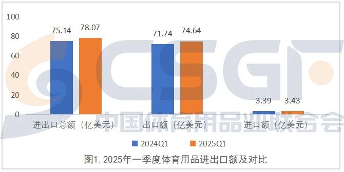 据海关总署统计数据,一季度,体育用品进出口总额78.07亿美元,较上年同期增长3.90%;其中,出口74.64亿美元,同比增长4.04%;进口3.43亿美元,同比增长1.18%。