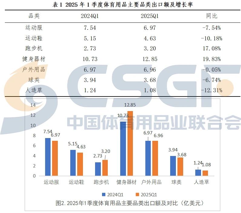 总的来看,在贸易环境不利的情况下一季度体育用品出口实现开门红,进出口双双实现增长,对外贸易韧性十足。对美出口实现同比9.64%的增长,市场份额进一步提升,对英国、德国、荷兰、加拿大传统市场的出口也实现较大增幅。在主要出口品类上,健身器材、跑步机成为支撑出口增长的关键力量,为一季度体育用品出口增长贡献率达到89.31%;其他品类如运动鞋服、人造草、球类产品等表现不佳,同比出现不同程度下滑。