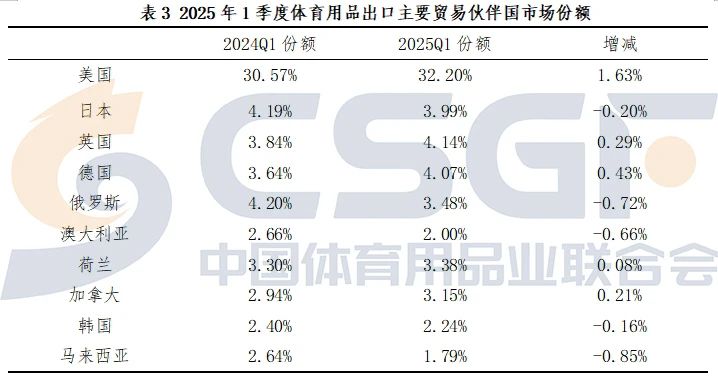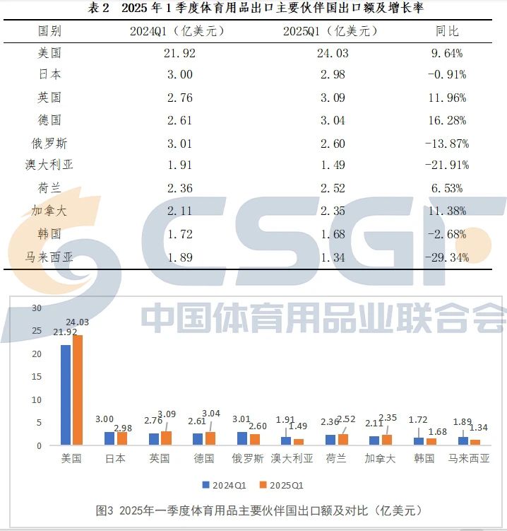 跟踪观察2024年体育用品出口前十位的国家发现,在今年一季度,我国对这些国家体育用品出口出现较大幅度波动。其中,对美国体育用品出口24.03亿元,同比增长9.64%;对英国、德国、荷兰、加拿大出口也实现较大增长。对日本、俄罗斯、澳大利亚、韩国、马来西亚出现下滑,特别是对马来西亚、澳大利亚出口分别同比下降29.34%、21.91%。如表2所示。