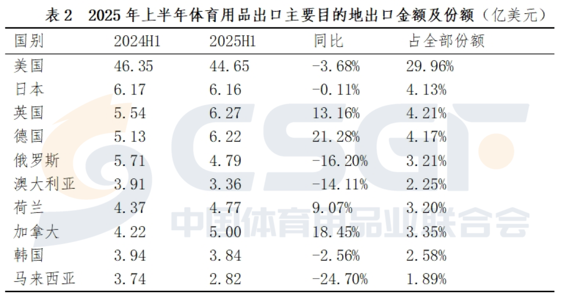 美国作为我国体育用品出口最大市场,今年上半年占据出口份额的29.96%,较2024年度31.44%的市场份额略有下降,但其规模仍然超过其他九国的总和。