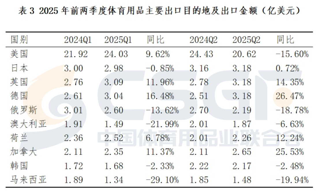 在2024年体育用品出口额排在前十位的国家中,今年上半年对美国出口44.65亿美元,较去年同期下降3.68%。对英国、德国、荷兰、加拿大出口实现较大幅度增长,出口额分别为6.27亿美元、6.22亿美元、4.77亿美元、5.00亿美元,同比增长分别为13.16%、21.28%、9.07%、18.45%;对日本、韩国出口保持相对稳定,分别微幅下滑0.11%、2.5%;对俄罗斯、澳大利亚、马来西亚出口出现大幅度下降。