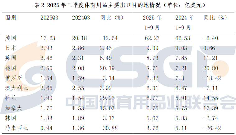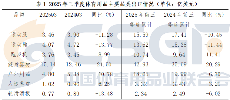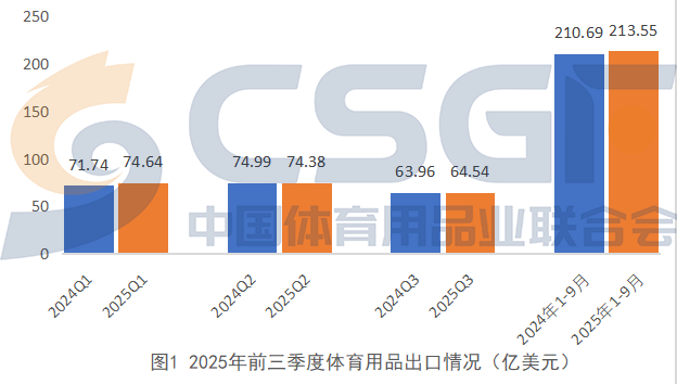 2025年初以来,国际贸易环境更加复杂严峻,体育用品出口全面承压。由于对美国市场高度依赖,中美贸易冲突对体育用品出口造成的冲击更加明显,前三季度体育用品出口同比增长1.36%,显著低于我国货物贸易出口6.1%的增幅。