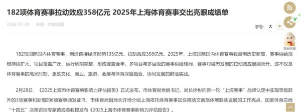 · 2025上海举办182项体育赛事创历史新高,拉动效应达358亿元