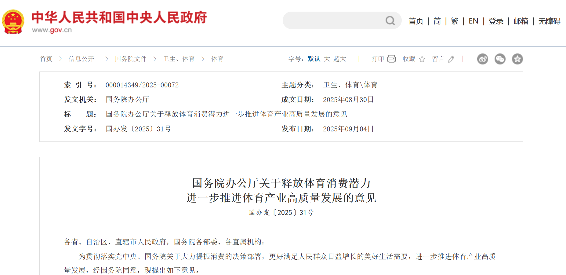 国务院办公厅日前印发《关于释放体育消费潜力进一步推进体育产业高质量发展的意见》(以下简称《意见》)。之前,8月22日召开的国务院常务会议有一项议题就是研究释放体育消费潜力进一步推进体育产业高质量发展的意见。