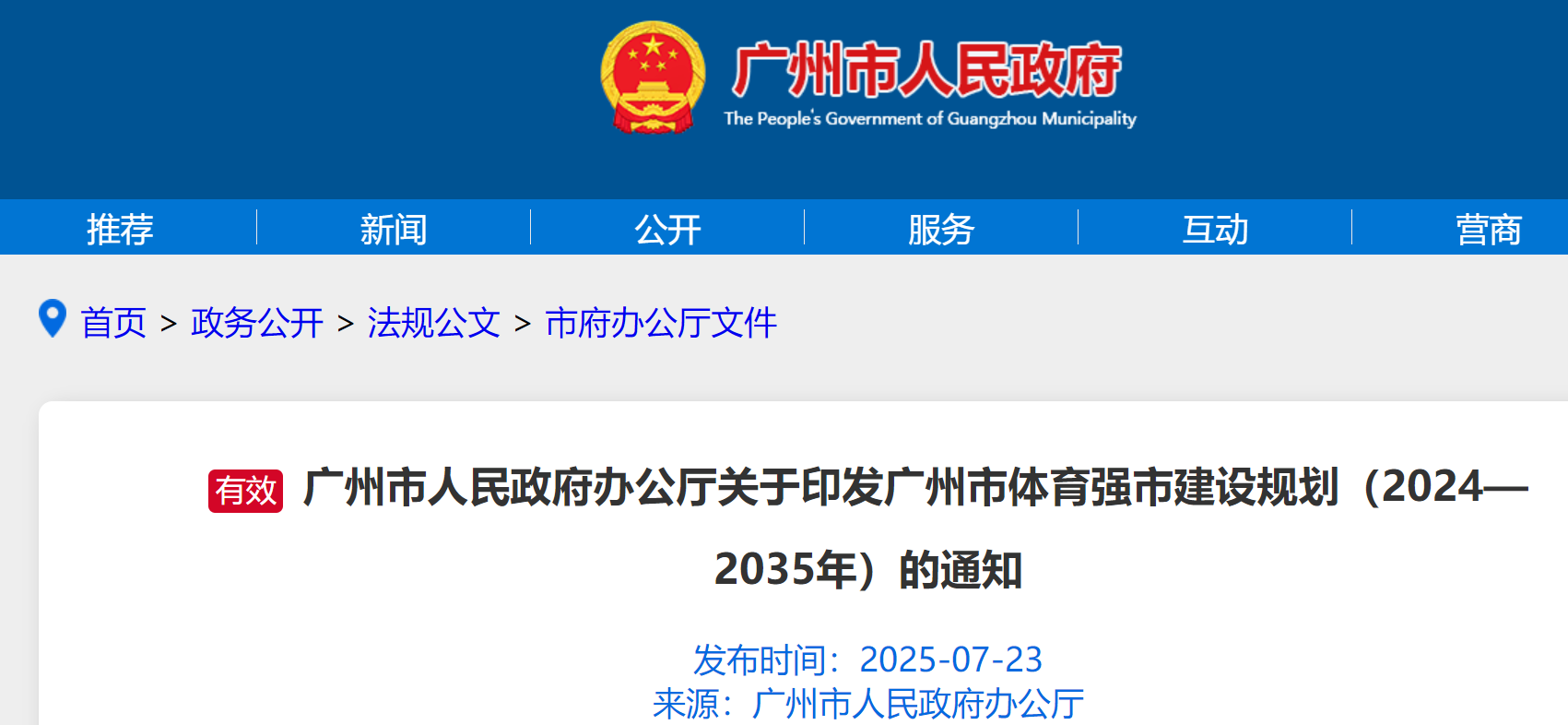 广州市人民政府办公厅印发《广州市体育强市建设规划(2024—2035年)》。《规划》提出全力建设三大国际中心,即国际体育消费中心、国际湾区体育中心、国际体育赛事中心的目标。同时,广州还将充分发挥粤港澳三地办赛经验与国际资源,推进联合申办世界杯等高水平国际赛事。