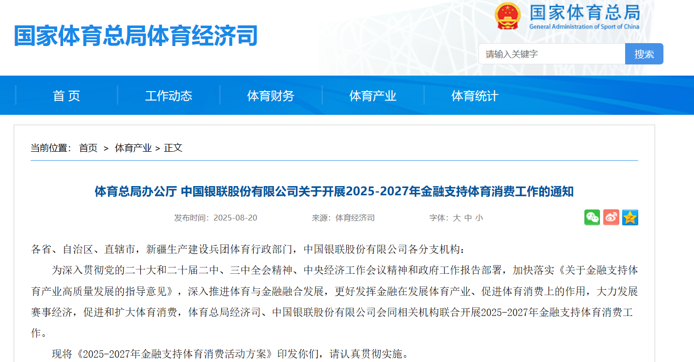 国家体育总局在深圳举办“全民全运”文体商旅融合促消费活动。活动中,中国银联执行副总裁胡浩中代表国家体育总局和中国银联,发布由双方联合制定的《2025-2027年金融支持体育消费活动方案》。