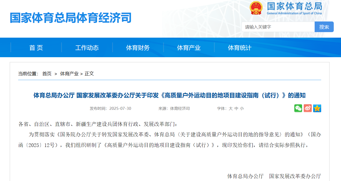 国家体育总局办公厅和国家发展改革委办公厅联合印发了《高质量户外运动目的地项目建设指南(试行)》,旨在有序推动高质量户外运动目的地的建设进程,全面提升项目的规划、实施及运营管理效能。