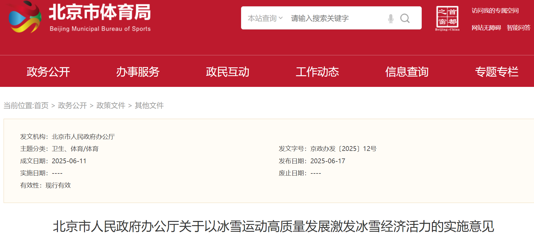 北京市人民政府《关于以冰雪运动高质量发展激发冰雪经济活力的实施意见》