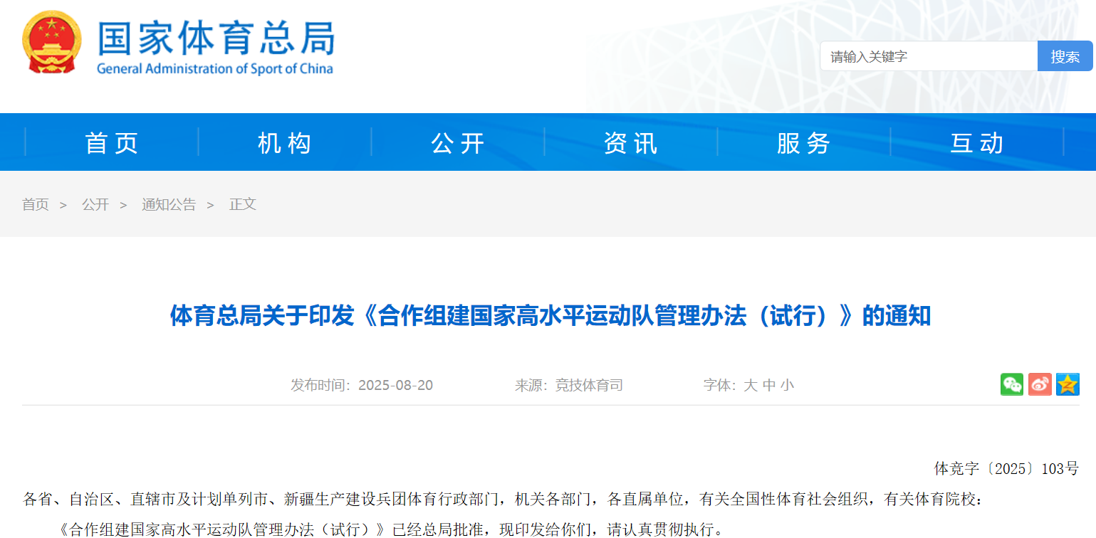 国家体育总局正式印发《合作组建国家高水平运动队管理办法(试行)》,将推动部分项目和地方省体育局、各级各类学校、社会组织及其他企事业单位共建国家队。共建形式分两类:联建共建类和委托承办类。合作周期一般不超过4年,并与奥运周期保持一致。合作组建国家青年(集训)队(组)、国家少年(集训)队(组)的合同周期由合同各方协商确定,但单个合同周期一般不超过8年。