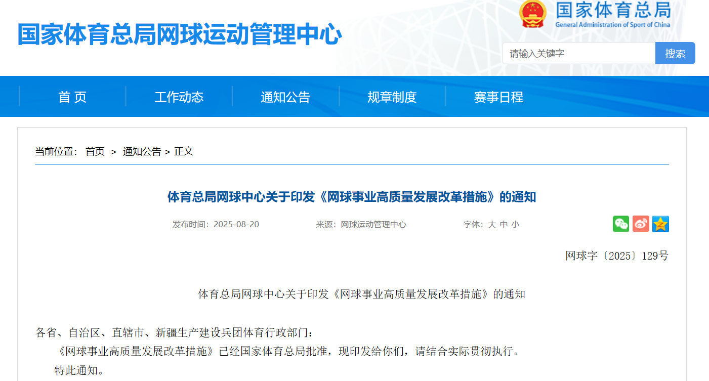 国家体育总局网球运动管理中心发布《网球事业高质量发展改革措施》,通过社会化构筑大众网球生态、多元化建设“大国家队”、系统化推进“大青训”体系、品牌化打造网球竞赛体系、差异化推动基层人才培养效能升级等改革,构建为大众服务、为国家争光、为经济助力、为社会赋能的中国网球事业高质量发展新格局。