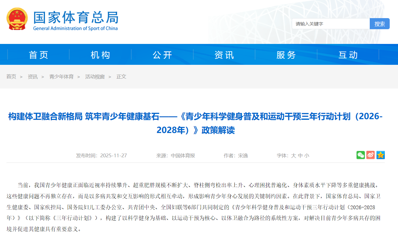 国家体育总局等6部门发布《青少年科学健身普及和运动干预三年行动计划》