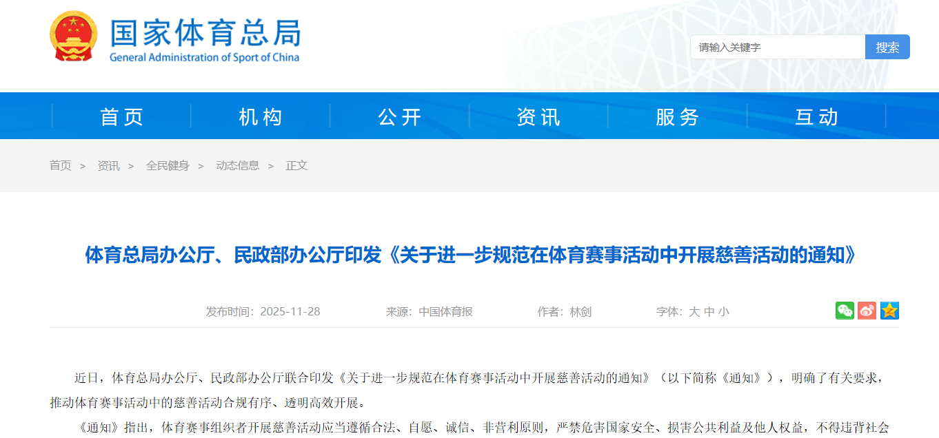 国家体育总局印发《关于进一步规范在体育赛事活动中开展慈善活动的通知》