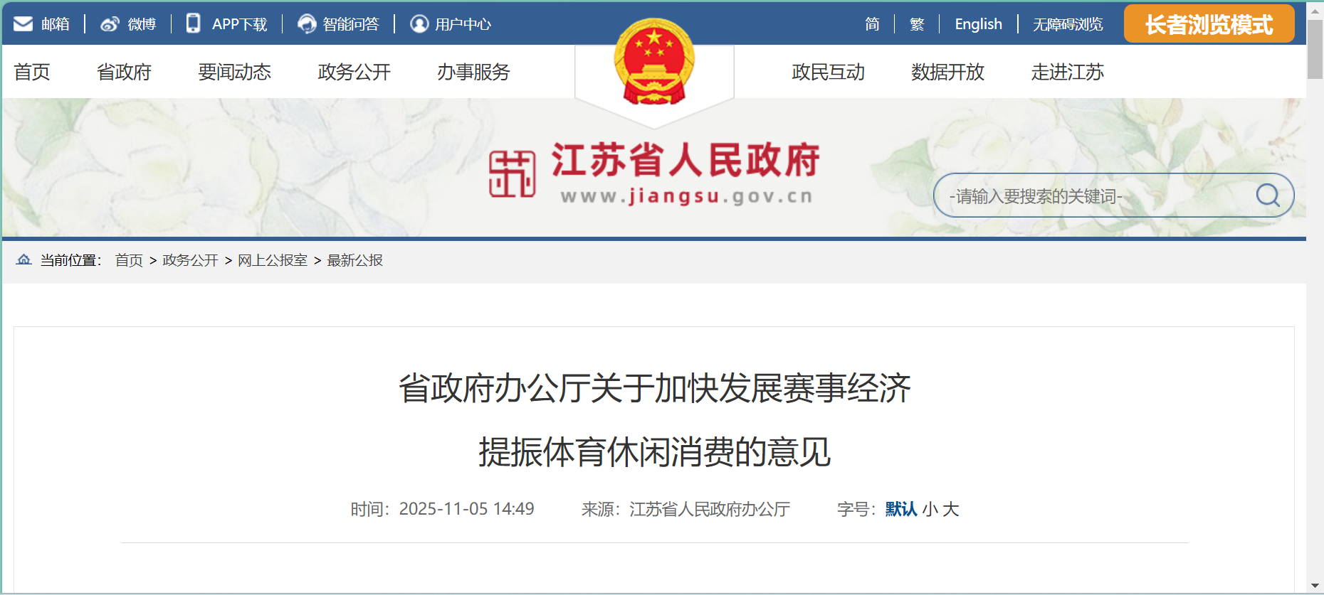 江苏省出台关于加快发展赛事经济提振体育休闲消费的意见