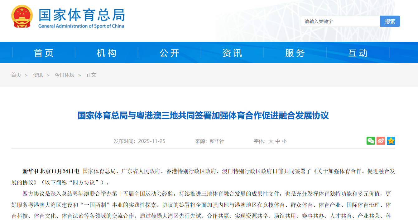 国家体育总局、广东省人民政府、香港特别行政区政府、澳门特别行政区政府在深圳共同签署了《关于加强体育合作、促进融合发展的协议》。四方协议是深入总结粤港澳联合举办第十五届全国运动会经验,持续推进三地体育融合发展的成果性文件,也是充分发挥体育独特功能和多元价值,更好服务粤港澳大湾区建设和“一国两制”事业的实践性探索。