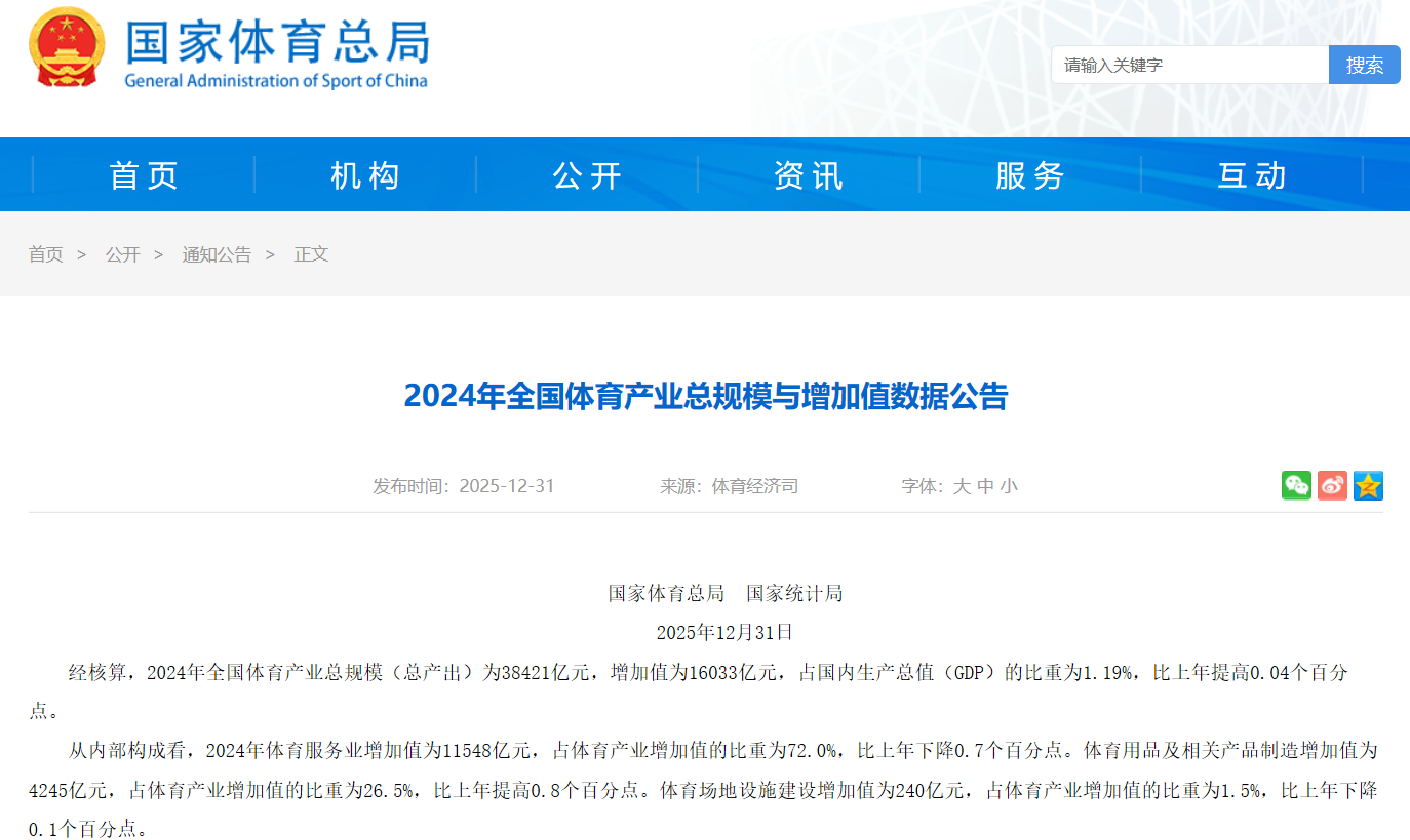 近日,国家统计局和国家体育总局共同发布了2024年全国体育产业总规模与增加值数据公告。