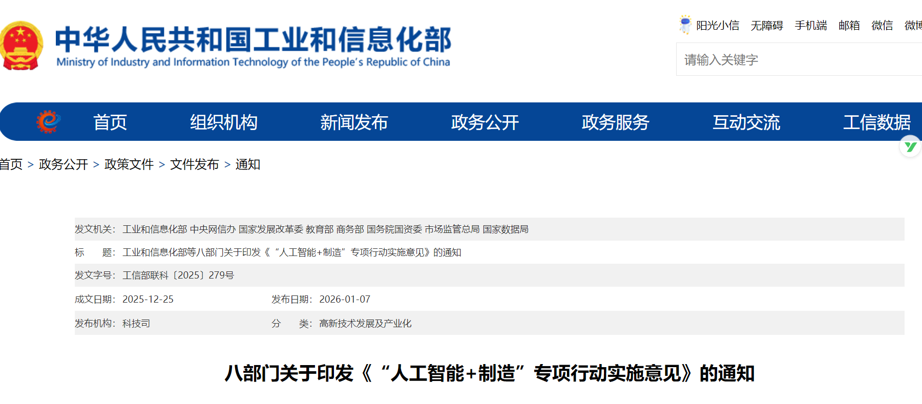 八部门联合印发《“人工智能+制造”专项行动实施意见》