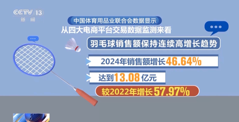 中国体育用品业联合会数据显示,从四大电商平台交易数据监测来看,羽毛球销售额保持连续高增长趋势,2024年销售额增长46.64%,达到13.08亿元,较2022年增长了57.97%。