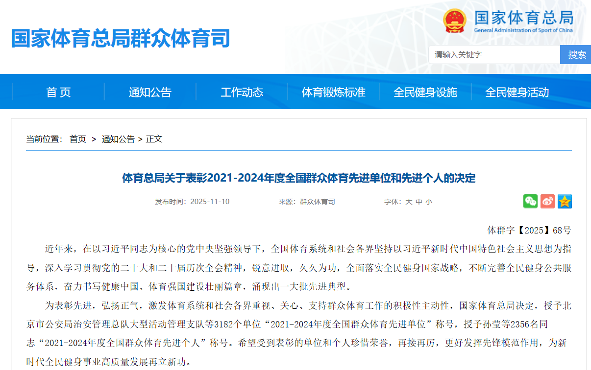 不久前,国家体育总局发布“关于表彰2021-2024年度全国群众体育先进单位和先进个人的决定”,中国体育用品业联合会(以下简称“联合会”)正式荣获国家体育总局授予的“2021-2024年度全国群众体育先进单位”称号。