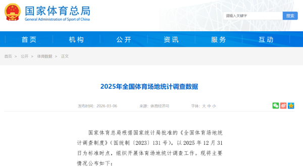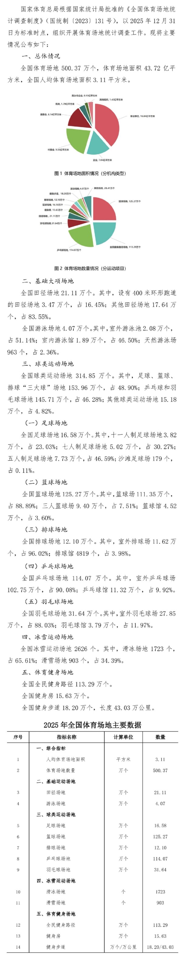 人均体育面积3.11平方米,2025年全国体育场地统计调查数据公布