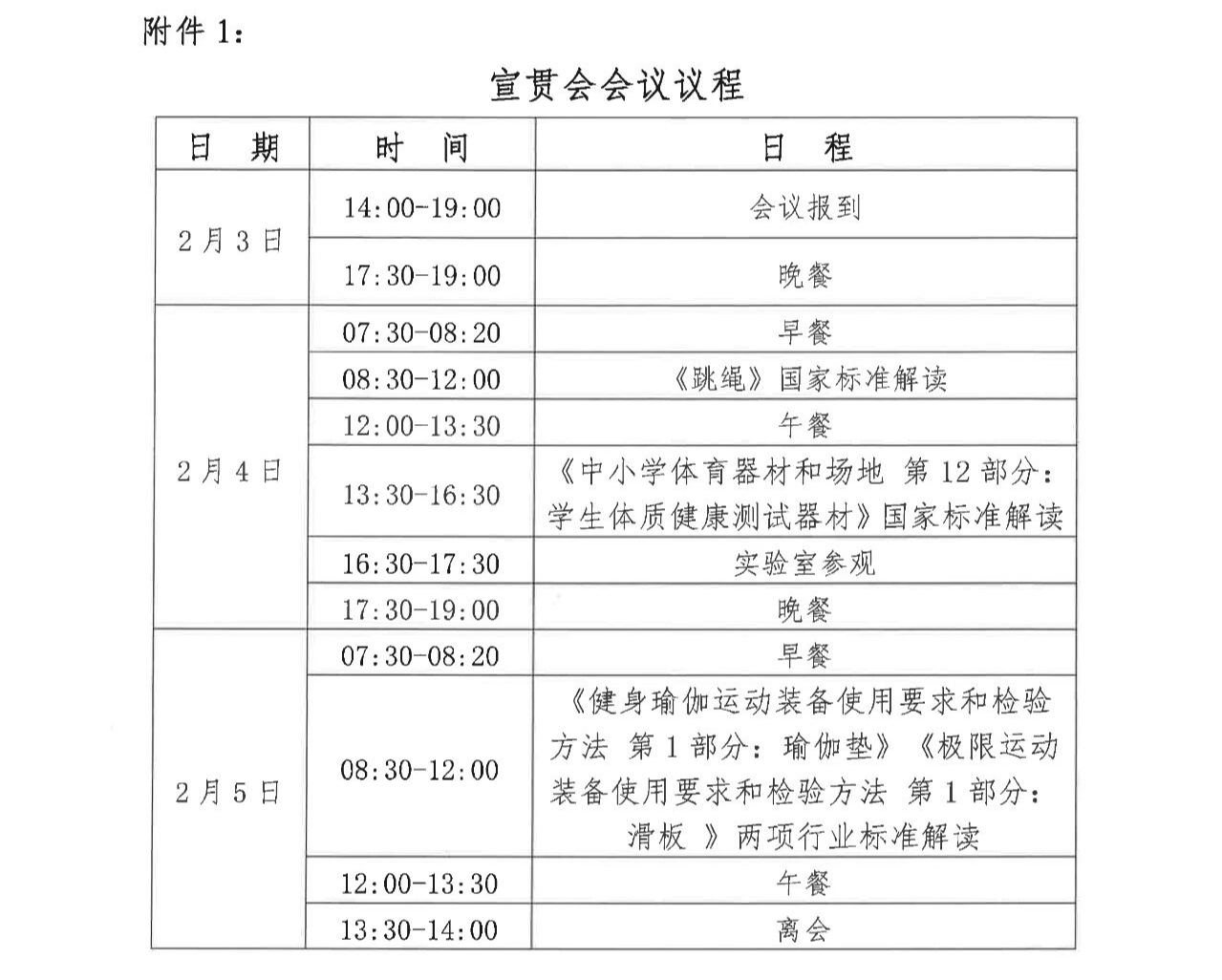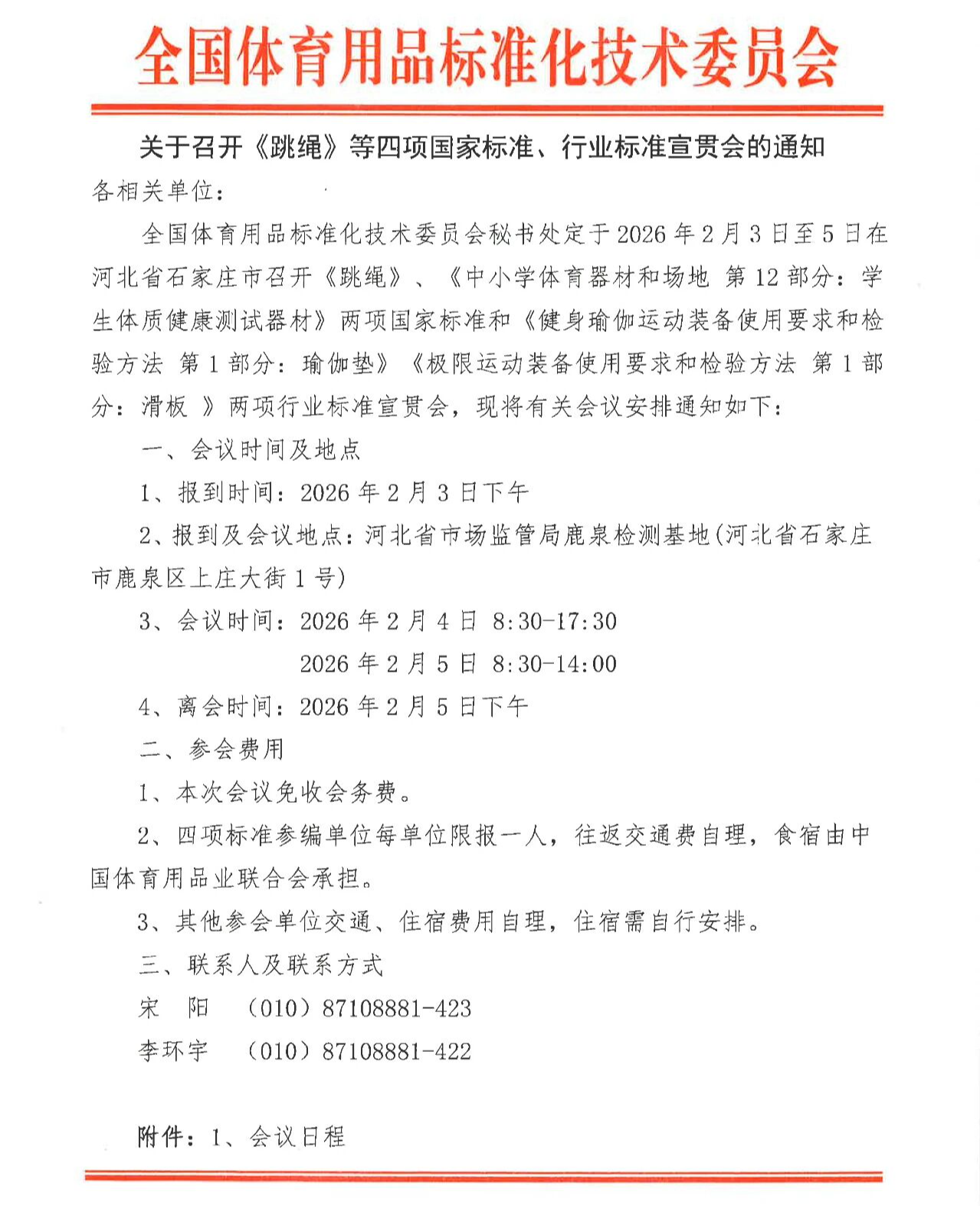 全国体育用品标准化技术委员会秘书处定于2026年2月3日至5日在河北省石家庄市召开《跳绳》《中小学体育器材和场地 第12部分:学生体质健康测试器材》两项国家标准和《健身瑜伽运动装备使用要求和检验方法 第1部分:瑜伽垫》《极限运动装备使用要求和检验方法 第1部分:滑板 》两项行业标准宣贯会,现将有关会议安排通知如下: