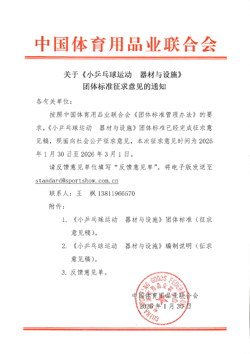 按照中国体育用品业联合会《团体标准管理办法》的要求,《小乒乓球运动器材与设施》团体标准已经完成征求意见稿,现面向社会公开征求意见,本次征求意见时间为2026年1月30日至2026年3月1日。请反馈意见单位填写“反馈意见单”,将电子版发送至standard@sportshow.com.cn